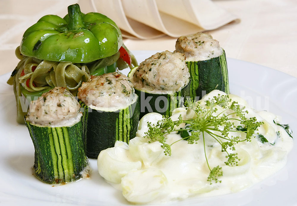 Elkészítési mód:A cukkinikat jól átmossuk, egyenlő 5-6 cm-es darabokra vágjuk, a belsejét kiszedjük és félretesszük. A paprika csuma felőli részét levágjuk, a belsejétől megtisztítjuk. A tésztát és a rizst külön-külön enyhén sós vízben megfőzzük, majd leszűrjük. A vajat felolvasztjuk, belerakjuk a kivágott cukkini belsejét és a finomra vágott kaprot. Rövid ideig pároljuk, liszttel megszórjuk (stauboljuk), tejjel felöntjük, sóval ízesítjük és tejföllel dúsítjuk. Menet közben a darált húst összegyúrjuk a rizzsel, a tört fokhagymával, a finomra vágott petrezselyemzöldjével és sóval, borssal ízesítjük. A cukkini gyűrűket megtöltjük a kész töltelékkel. Állítva egy sütőpapírral bélelt tepsibe rakjuk és 150 °C-os előmelegített sütőben megsütjük. A paprika nagyobbik felébe beletesszük a metélt tésztát és a kalapjával befedjük, 200 °C-os előmelegített sütőben 4-5 perc alatt készre sütjük. Ízlésesen forrón, kapor virággal díszítve tálaljuk.