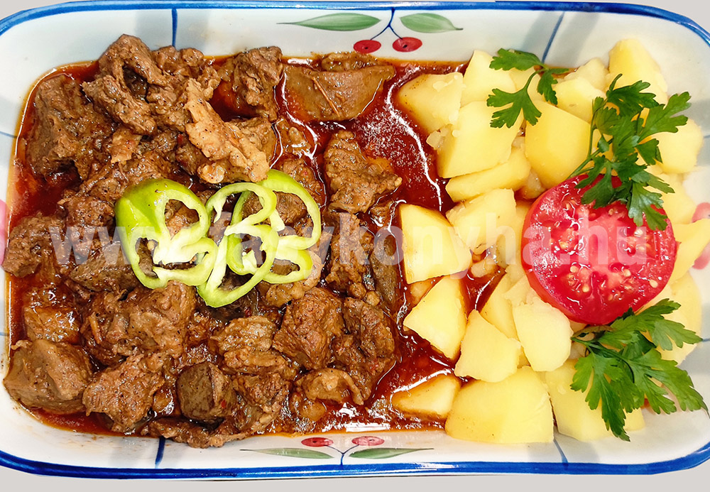 A vöröshagymát zsíron megpirítjuk, majd hozzáadjuk az átmosott, felkockázott bőrös sertéscsülköt, májat és combot. Sóval, borssal, köménymaggal fűszerezzük, zsírjára sütjük, azután belerakjuk a héjától leforrázott paradicsomot, a kockákra vágott paprikát és a zúzott fokhagymát. Meghintjük őrölt pirospaprikával, összekeverjük, zsírjára pörköljük, majd felöntjük annyi vízzel, hogy ellepje, és állandó kevergetés mellett lassú tűzön puhára főzzük. Közben a tisztított, felkockázott burgonyát enyhén sós vízben megfőzzük, leszűrjük, lecsepegtetjük, majd paprikával, paradicsommal díszítve köretként tálaljuk a sertéspörkölt mellé.