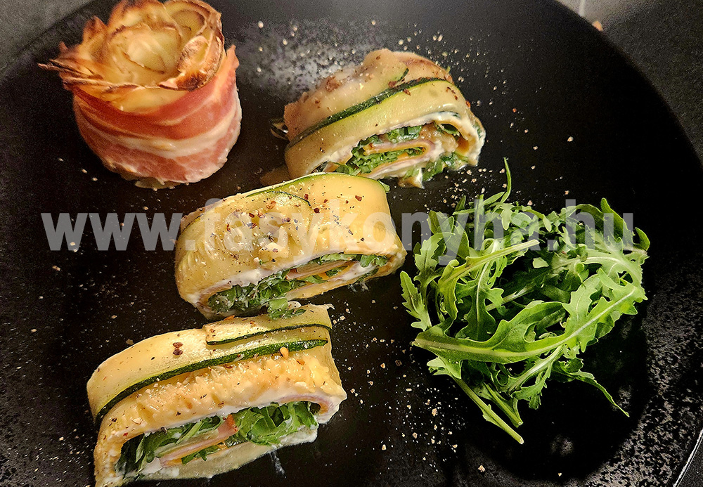 A vékony szeletekre vágott cukkinit kevés olívaolajon, enyhén megpirítjuk, majd papírtörlővel felitatjuk a felesleges zsiradékot. A szeleteket sütőpapírra helyezzük két sorban, úgy, hogy fedjék egymást. A krémsajtot összekeverjük a tejföllel, az aprított bazsalikommal, egy fél lime frissen facsart levével, sóval ízesítjük, és alaposan elkeverjük. A krémet egyenletesen eloszlatjuk a cukkiniszeleteken, erre tesszük rá a sonkát, a sajtot és végül halmozzunk rá egy marék rukkolát. A sütőpapír segítségével gondosan feltekerjük, ügyelve arra, hogy szoros, de mégis könnyed tekercset kapjunk. Az így elkészült tekercset néhány órára hűtőbe tesszük, hogy összeérjenek az ízek, majd szeletelve kínáljuk.