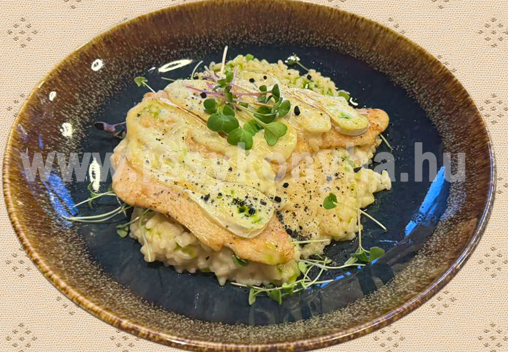 A csirkemellet felszeleteljük, sóval ízesítjük, vajban pároljuk majd sütőpapírral bélelt tepsibe rakjuk, ráhelyezzük a szeletelt camembert sajtot, szalamanderbe tesszük, és addig sütjük, míg a sajt a húsra ráolvad. Végezetül sajtos rizottóra zöldborsó csírával díszítve, őrölt borssal meghintve esztétikusan tálaljuk.