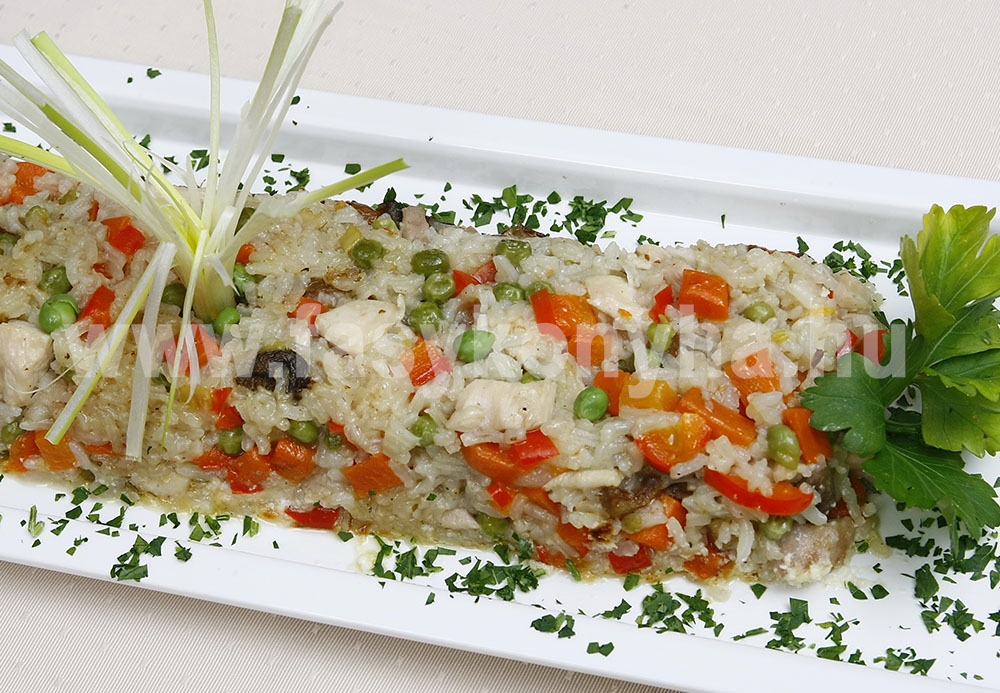 A húst, a hagymát, a zöldségekkel együtt felkockázzuk, a fokhagymát és a petrezselyemzöldjét pedig finomra vágjuk. A gombával együtt zsíron, állandó kevergetés mellett, fedő alatt megpároljuk, sóval ízesítjük, és kevés folyadék hozzáadásával puhára főzzük. Menet közben a rizst enyhén sós vízben megfőzzük, leszűrjük és hozzáadjuk a zöldborsóval együtt a raguhoz, majd összekeverjük. Őzgerincformába rajuk, enyhén sós, borsos simára kevert tejföllel lefedjük, majd előmelegített 180 °C-os sütőben aranybarnára sütjük. Tányérra borítjuk, a formát levesszük róla, újhagymával és petrezselyemzöldjével díszítve tálaljuk.