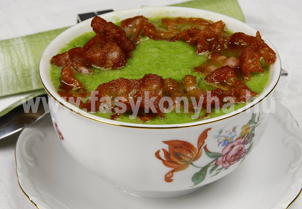 3 dkg vajon megdinszteljük a finomra vágott vöröshagymát, majd belerakjuk a zöldborsót és felöntjük 8 dl vízzel. Vegetával, sóval ízesítjük. 8-10 perc alatt puhára főzzük. Botmixerrel krémesítjük, beleöntjük a tejszínt és még egyszer felforraljuk. Menet közben 2 dkg vajon a megpirított vékonyra szeletelt bacon szalonnával tálaljuk.