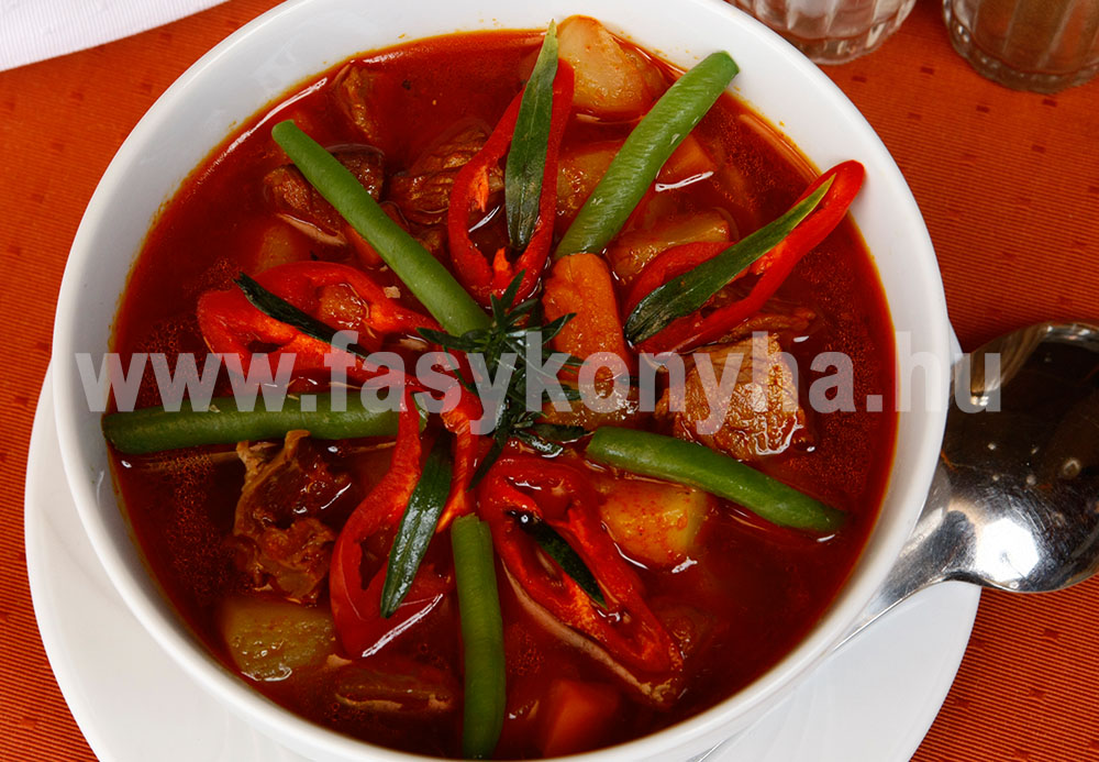 A szürkemarha lábszárat, a szalonnát, a hagymát, a zöldpaprikát, a paradicsomot, a zöldségeket, a tisztított burgonyát kockákra, a tárkonyt és a fokhagymát finomra vágjuk. Egy fazékban zsíron megpirítjuk a szalonnát, majd hozzáadjuk a hagymát, megdinszteljük, belerakjuk a húst, a zöldpaprikát, a héjától megtisztított, forrázott paradicsomot és a zúzott fokhagymát. Zsírjára pörköljük, meghintjük kalocsai őrölt paprikával, 1 dl vízzel felöntjük, köménnyel, sóval, friss tárkonnyal fűszerezzük, majd lassú tűzön, állandó folyadékpótlással a húst félpuhára főzzük. Hozzáadjuk a burgonyát és a zöldségeket, valamint a zöldbabot. Fedő alatt rövid ideig pároljuk, majd felöntjük 8 dl vízzel, felforraljuk és lassú lángon tovább főzzük. Forrón tálaljuk, tárkonnyal, paprikával, zöldbabbal díszítve tálaljuk.