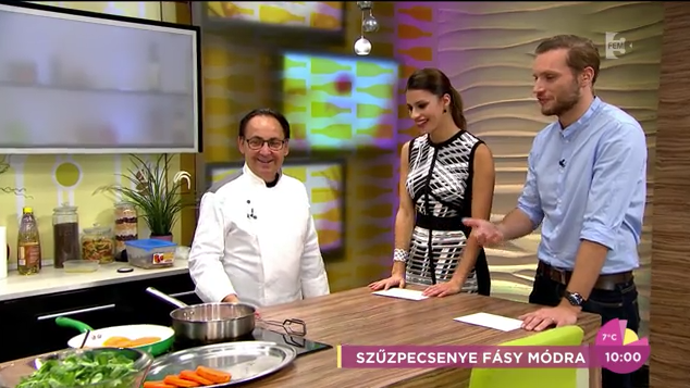 Fásy Ádám szűzpecsenyét készített kolozsvári szalonnával és sütőtököt mézben karamellizálva, amit madársalátával tálalt. |