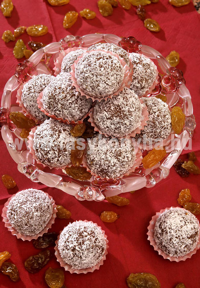 Elkészítési mód:A kekszet elkeverjük a szobahőmérsékletű vajjal, a cukrokkal és a kakaóval. A rumaromával ízesített meggyléből annyit teszünk hozzá, hogy könnyen formálható legyen. Nedves kézzel golyókat formálunk a masszából, és egyenként megforgatjuk őket a kókuszreszelékben. A kész kókuszgolyókat fogyasztásig, kb. 1 órára hűtőszekrénybe tesszük, hogy kissé megkeményedjenek és az ízek összeérjenek.