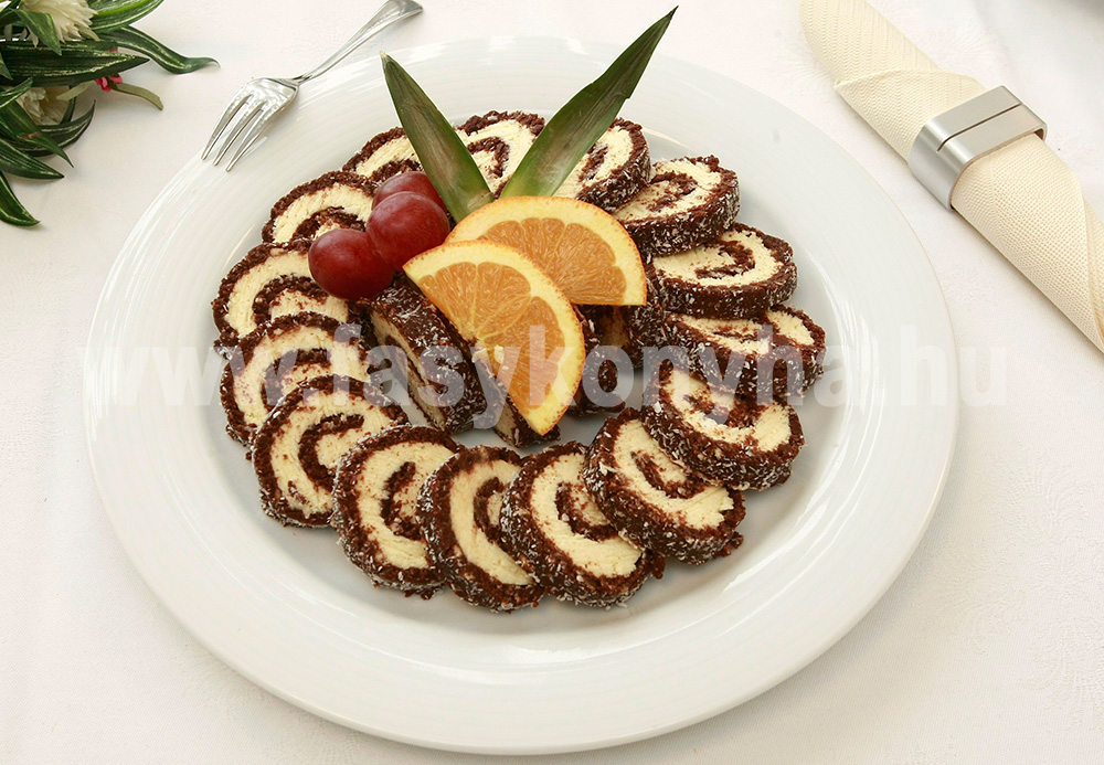 Elkészítési mód:A kókuszreszeléken kívül a tészta hozzávalóit jól összegyúrjuk. Zsírpapíron egy ujjnyi vastagra kinyújtjuk, azután elkészítjük a tölteléket. A vajat, a cukrokkal habverővel jó habosra felverjük, majd hozzáadjuk a kókuszreszeléket és összekeverjük. A kész krémet egyenletesen elterítjük a kinyújtott tésztán. A papír segítségével óvatosan feltekerjük. Kókuszreszelékbe beleforgatjuk. Hűtőben pihenni hagyjuk, azután tálalásnál 1 cm-es egyforma szeletekre vágjuk.