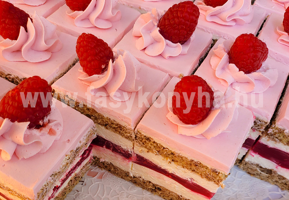 A cukrokat, az olajat és a tojásokat simára keverjük, hozzáadjuk a sütőporral és a kakaóporral átszitált lisztet, majd az egészet összedolgozzuk. Kivajazott sütőedényben egyenletesen elsimítjuk, és 170 °C-os előmelegített sütőben megsütjük, majd ha kihűlt kettévágjuk. A málnás aszpikhoz a zselatint 5 dl langyos vízben habverővel simára keverjük, majd hozzáadjuk a leturmixolt málnát, a cukrot és 10 perc alatt készre főzzük. Egy tálcára kiöntjük és kb. 2 órára hűtőszekrénybe rakjuk. Addig a túrókrémhez a vajat felhevítjük, hozzáadjuk a pudingport, tejjel felöntjük és felforraljuk, majd belerakjuk a túrót, a tejfölt, a cukrokat, a simára kevert tojássárgáját, a citrom levével ízesítjük és krémesre főzzük. A tojásfehérjét kemény habbá verjük, és óvatosan hozzákeverjük a langyos krémhez, majd kétfelé osztjuk és félretesszük. A málnakrémhez vízgőz felett felolvasszuk a fehér csokoládét és a fokozatosan hozzáadott tejszínnel simára keverjük. A megmosott málnát a vaníliás cukorral együtt felfőzzük, azután botmixerrel turmixoljuk. A pudingport a cukorral és a tejjel krémesre főzzük, hozzáadjuk a pépesített málnát és a fehér csokoládés tejszínt, majd a habverőgéppel felhabosítjuk a vajat és a krémmel összekeverjük. Végezetül összeállítjuk a desszertet. Az első tésztalapon egyenletesen eloszlatjuk a túrókrém felét, majd a megdermedt málnás aszpikot ráborítjuk. Erre jöhet a túrókrém másik fele egyenletesen eloszlatva, azután a másik tésztalappal zárjuk. A tetejét málnakrémmel befedjük, hűtőbe rakjuk. Tálalás előtt kockákra vágjuk, a tetejét tetszés szerint málnakrémmel és málnával díszítjük.