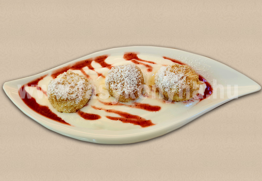 Az áttört túrót a búzadarával, a tojásokkal, a liszttel, a cukorral és egy csipet sóval összekeverjük, vizes kézzel gombócokat formázunk, azt követően enyhén sós forró vízben rövid idő alatt megfőzzük, leszűrjük. A zsemlemorzsát olajon megpirítjuk, majd a gombócokat beleforgatjuk. Közben vajon a vaníliáscukrot felhevítjük, hozzáadjuk a simára kevert tejfölt és felfőzzük. A málnát cukorral, szegfűszeggel, őrölt fahéjjal ízesítjük, fél dl folyadékkal felöntjük és botmixerrel krémesítjük. A túrógombócokat vaníliamártással és málnakrémmel tálaljuk.
