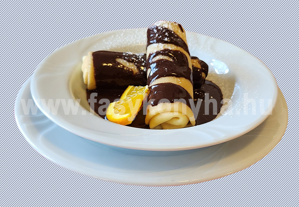 Menet közben a tejet a kakaóporral, a porcukorral és az étolajjal sűrűre főzzük. A tűzről levéve hozzákeverjük a vajat és az így kapott krémes csokimártással leöntjük a palacsintát és naranccsal díszítve tálaljuk.