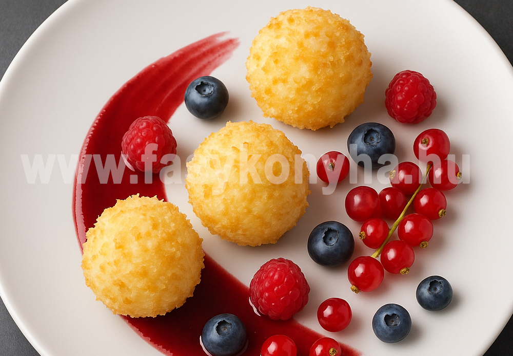 Az áttört túrót a búzadarával, a tojásokkal, a reszelt citromhéjával, a cukorral és egy csipet sóval összekeverjük, vizes kézzel gombócokat formázunk, azt követően enyhén sós forró vízben kifőzzük és leszűrjük. A zsemlemorzsát megpirítjuk, majd a gombócokat beleforgatjuk és porcukorral meghintjük. A málnaszörpöt 1 dl vízzel felforraljuk, majd hagyjuk kihűlni, azután erdei gyümölcsökkel esztétikusan tálaljuk a gombócokkal.