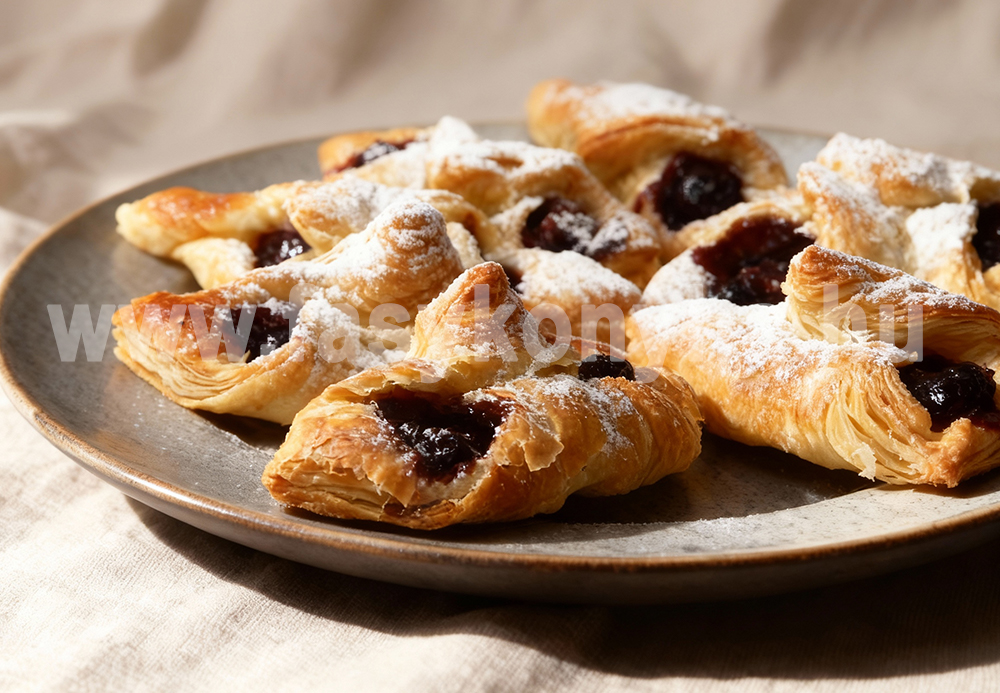 A megtisztított, ledarált hájat az ecettel és 10 dkg liszttel alaposan összedolgozzuk, botmixerrel vagy kézi habverővel habosítjuk, majd legalább 30 percre hidegre tesszük. A többi hozzávalóból jól kidolgozott, hólyagos tésztát dagasztunk. Szobahőmérsékleten 15 percig pihentetjük, azután lisztezett deszkán vékonyra nyújtjuk. A pépes, lisztes hájat egyenletesen rásimítjuk, négybe hajtjuk, ismét kinyújtjuk a lisztezett nyújtófával, majd 20 percre hűtőbe tesszük a tésztát és ezt a műveletet háromszor megismételjük. Ezt követően lisztezett deszkán nyújtófával téglalap alakúra kinyújtjuk. 5x5 cm-es kockákra vágjuk, a szilvalekvárt a közepére rakjuk és a két szemben lévő csücskét egymásra hajtjuk papucsformára. 180 °C-os előmelegített sütőben 10-15 perc alatt készre sütjük. Tálalásnál porcukorral meghintve kínáljuk.