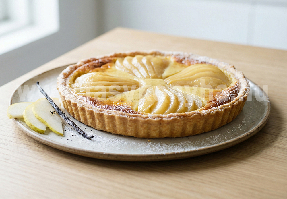 A körtéket meghámozzuk, félbevágjuk, magházukat eltávolítjuk. Egy lábasban felforraljuk a vizet a cukorral, a vanília kikapart magjaival és rúdjával, a citromlével és a csillagánizzsal, belehelyezzük a körtéket, és lassú tűzön 20–25 perc alatt puhára főzzük, vigyázva, hogy ne essenek szét. A körtéket kiemeljük, a főzőlevet pedig sziruposra sűrítjük, félretesszük. A lisztet elmorzsoljuk a hideg, felkockázott vajjal, a porcukorral, a sóval, hozzáadjuk a tojást és összegyúrjuk, szükség esetén 1–2 evőkanál hideg vizet adunk hozzá. Fóliába csomagolva legalább 30 percre hűtőbe tesszük, majd a tésztát kinyújtjuk, kibélelünk vele egy kivajazott, lisztezett, 24–26 cm-es piteformát (kivehető aljú), az alját megszurkáljuk, azután visszatesszük a hűtőbe. A mandulakrémhez a puha vajat a porcukorral habosra keverjük, egyesével hozzáadjuk a tojásokat, majd beleforgatjuk az őrölt mandulát, lisztet, vaníliát és mandulaaromát. A krémet a tésztára simítjuk, a kihűlt körtéket vékony szeletekre vágva legyező alakban a tetejére rendezzük. 180 °C-on 45–50 percig sütjük, majd forrón lekenjük a besűrített sziruppal. Porcukorral meghintve tálaljuk.
