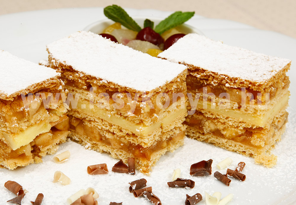 Az almát meghámozzuk, lereszeljük, hozzáadjuk a cukrokat, a fahéjat, a szegfűszeget és a reszelt citromhéját, majd mérsékelt tűzön addig pároljuk, amíg a leve elpárolog. Összeállítjuk a süteményt. Az alsó lapra rákenjük az almás töltelék felét, ráterítjük a második lapot, amin elsimítjuk a vaníliás krémet, majd a harmadik lappal befedjük, azután elterítjük a megmaradt almás tölteléket és a negyedik lappal lefedjük, azt követően óvatosan lenyomjuk. Hűtőbe rakjuk és másnap téglalap alakúra szeleteljük. Tálalásnál a tetejét porcukorral meghintjük.