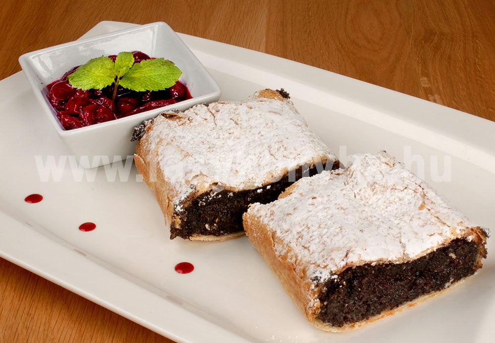 A cukrot a tejjel sűrűre főzzük, hozzáadjuk a mákot, a reszelt citrom héját, a mazsolát és kb. 5 perc alatt készre főzzük. A rétestésztát szétterítjük, megspricceljük olajjal, elterítjük rajta a kihűlt mákos tölteléket, majd óvatosan feltekerjük. Sütőpapírral kibélelt tepsibe rakjuk, a tetejét megkenjük olajba mártott kenőtollal, jó forró sütőbe téve, pirosra és ropogósra sütjük. Közben egy edénybe a magozott meggyet felforraljuk, beízesítjük, illatosítjuk a hozzávaló fűszerekkel, majd hagyjuk kihűlni. A porcukrozott rétes mellé szervírozzuk.