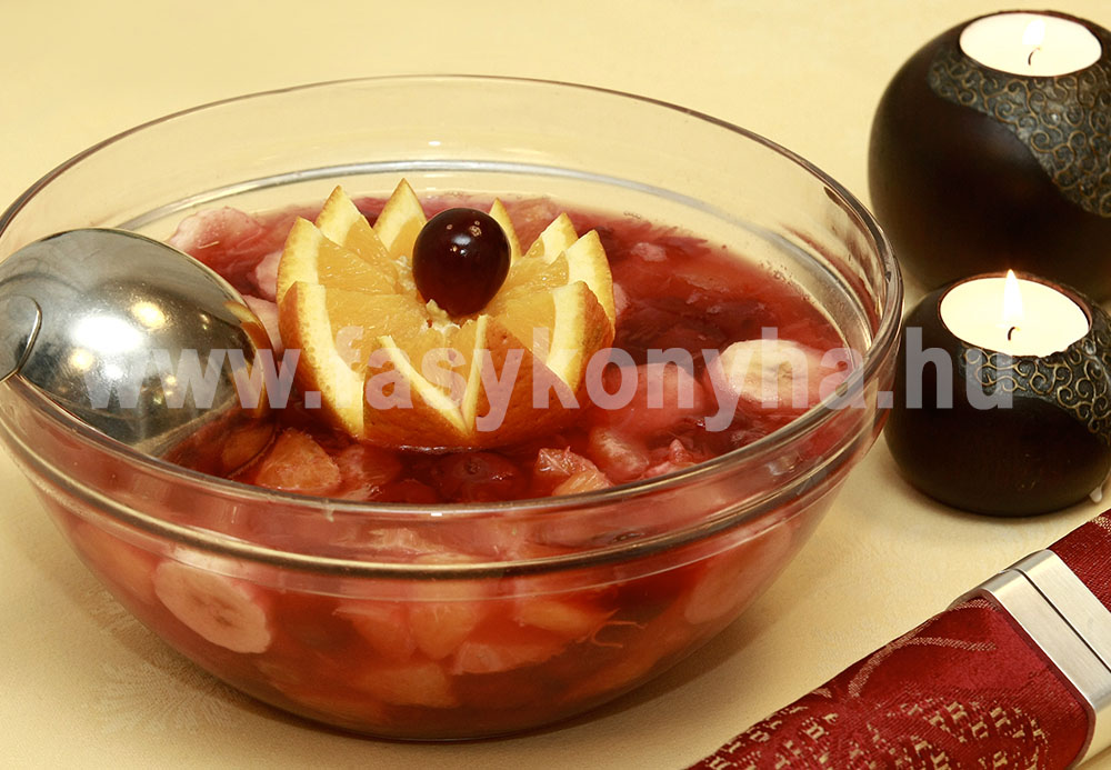 A mazsolát beáztatjuk a rumaromába. Összekockázzuk a gyümölcsöket, és egy tálba belerakjuk. Hozzáadjuk a meggybefőttet levével együtt. 5 dl szódavízzel összekeverjük a citromlevet, a málnaszörpöt és ráöntjük a gyümölcsökre, majd belerakjuk a rumba áztatott mazsolát. Ezt követően az egészet összekeverjük. Tálalás előtt, három órán keresztül hűtőben állni hagyjuk.