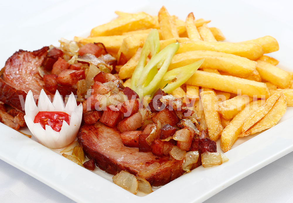 A felszeletelt sertéskaraj sóval meghintjük és mindkét oldalát megsütjük. A kockázott szalonnát és a hagymát megdinszteljük, majd a hússal együtt fedő alatt megpároljuk. A menet közben megsült hasábburgonyával együtt hagymával, paprikával díszítve, ízlésesen kínáljuk.