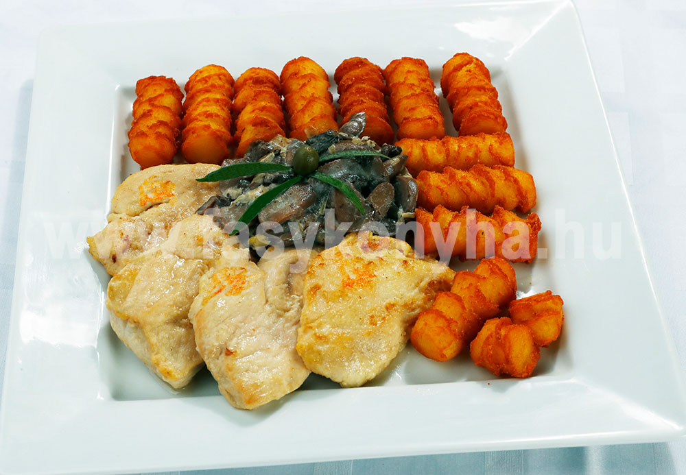 Elkészítési mód:A pulykamellfilét 8 szeletre vágjuk, sóval meghintjük, enyhén kiklopfoljuk és kevés olajban megsütjük. A hagymát, a friss zsályát finomra, a fokhagymát karikákra vágjuk, olajon megfuttatjuk, majd hozzáadjuk a gombát, összekeverjük, sóval, gyömbérrel ízesítjük és rövid idő alatt készre pároljuk. A vargányagomba-ragut a krokettel együtt esztétikusan tálaljuk a sült hús mellé.