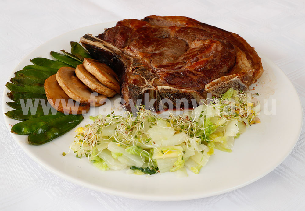 Elkészítési mód:Az érlelt marharostélyost többféleképpen süthetjük, ki hogyan szereti:- Rare (saignant): angolosan sült (52 °C - 1 perc) kívül szürkésbarna, belül piros.- Medium-rare: félig angolos (55 °C - 2 perc) kívül szürkésbarna, belül vörös.- Medium (point): félig átsült (60 °C - 3 perc) belseje piros-rózsaszín.- Medium-well done: (65 °C - 4 perc) a belseje rózsaszín.- Well done (bien cuit): (71 °C - 5 perc) átsült.Vajban megpároljuk az apróra vágott kínai kelt, a karikára vágott gombát és a hüvelyes zöldborsót, majd esztétikusan tálaljuk az elkészített hús mellé.