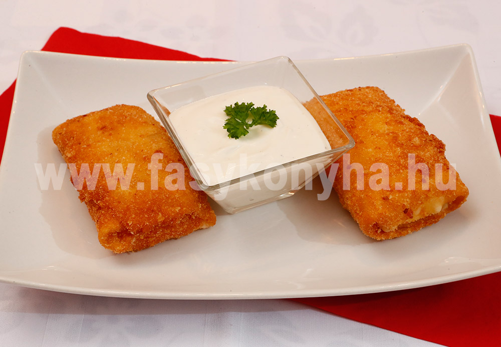 A kockázott hagymát olajon megdinszteljük, hozzáadjuk a darált húst, tört fokhagymával, sóval, borssal, őrölt babérlevéllel ízesítjük. Meghintjük őrölt pirospaprikával, majd felönjük annyi vízzel, hogy ellepje és puhára pároljuk. Menet közben a tészta hozzávalóit egy tálban kézi habverővel csomómentesre keverjük. A palacsintasütőt pár csepp olajjal felforrósítjuk, és kisütjük a palacsintákat. Azt követően a tölteléket elosztjuk a palacsintákba, majd a két szélét behajtjuk és feltekerjük. Felvert tojásba, majd zsemlemorzsába forgatjuk, és bő olajban aranybarnára sütjük. Ízlés szerint tartármártással tálaljuk.