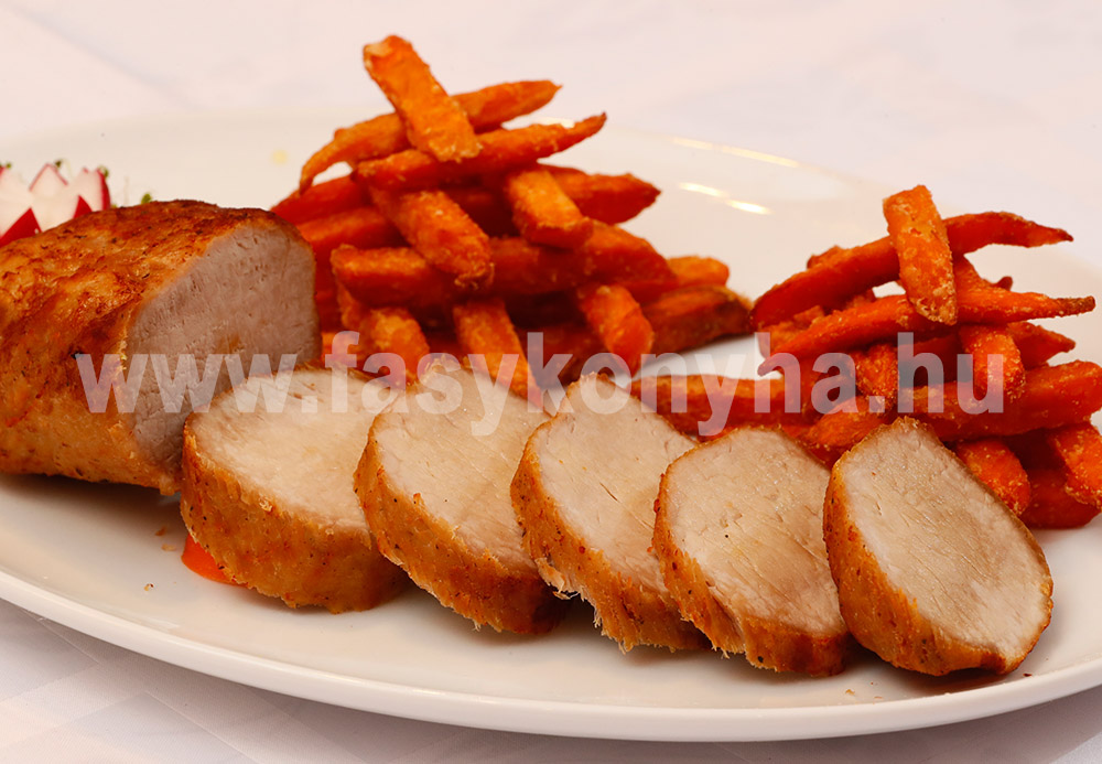 A húst egészben sóval bedörzsöljük, tepsibe rakjuk, mellé tesszük a zellert zöldjével együtt, két dl vízzel felöntjük és alufóliával hermetikusan lefedjük. 200⁰ C-os előmelegített sütőben 45 perc alatt puhára pároljuk. Azt követően a fóliát levesszük róla, a folyadékot leöntjük, olívaolajjal meglocsoljuk és mindkét oldalát aranybarnára sütjük. Menet közben a hámozott édesburgonyát hasábra vágjuk, forró olajban kisütjük, sóval ízesítjük és köretként tálaljuk a karaj mellé.