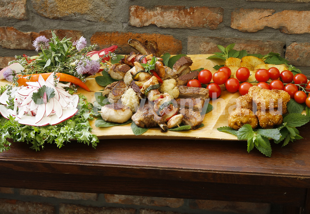 A sertés- és a borjúoldalast enyhén sós, fokhagymás, zsályás és oregánós fűszerezett vízben egy forralásig főzzük, majd hagyjuk kihűlni, és 2 napig hűtőben érleljük. A szűzérmét karikákra vágjuk, körbetekerjük mangalica szalonnával, sóval ízesítjük és pálcikára szúrjuk. A csirkemellet, a kolozsvári szalonnát kockákra, a paprikát, a cukkinit karikákra, a hagymát cikkekre vágjuk. Egymás után: hús, paprika, hagyma, szalonna, cukkini, majd a sorrendet megismételve pálcikákra húzzuk. A karfiolt rózsáira bontjuk, felét felvert enyhén sós tojásba, majd szezámmagos zsemlemorzsába forgatva kisütjük. A húsokat állandó locsolgatás mellett forgatva szép pirosra rostlapon megsütjük a megmaradt karfiollal együtt. A burgonyát megtisztítjuk, karikára vágjuk, és forró olajban restre sütjük. A retket és a zellert zsülienre vágjuk, sóval, citromlével ízesítjük, és rukkolasaláta ágyra rakjuk. A húsok mellé köretnek burgonyát és szezámmagos rántott karfiolt kínálunk, friss fűszernövényekkel és paprikával díszítjük.