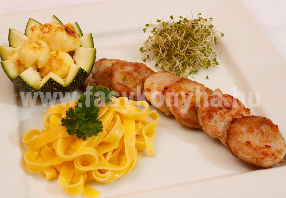 A sertésszüzet lehártyázzuk, felszeleteljük, sóval ízesítjük, lisztbe forgatjuk, majd olajon mindkét oldalát megsütjük. A cukkinigömböket megmossuk, éles késsel cakkozva kettévágjuk, a belsejéből gömbvájóval golyókat formázunk, majd vajon megpároljuk. Menet közben olívaolajon a zúzott fokhagymát megdinszteljük, és hozzáadjuk az enyhén sós vízben kifőzött, lecsurgatott tésztát. Köretként tálaljuk a gömbcukkinivel a hús mellé.