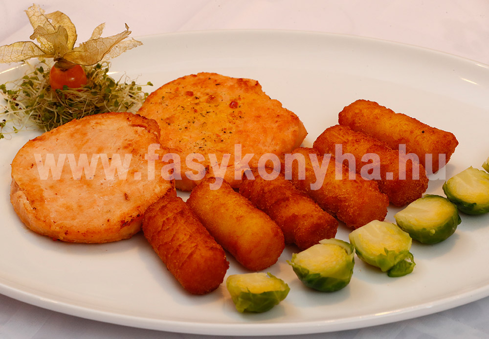 A lazacot ledaráljuk és a pépesre zúzott fokhagymával összegyúrjuk, sóval, borssal, zöldcitrommal ízesítjük és 1 napig hűtőszekrényben érleljük. Sütés előtt korongokat formálunk belőle, és forró olajon mindkét oldalát megsütjük. A kelbimbókat enyhén sós vízbe félpuhára főzzük, majd a felhevített vajon fedő alatt rövid idő alatt megpároljuk, a burgonyakrokettel esztétikusan tálaljuk a lazacburger mellé.
