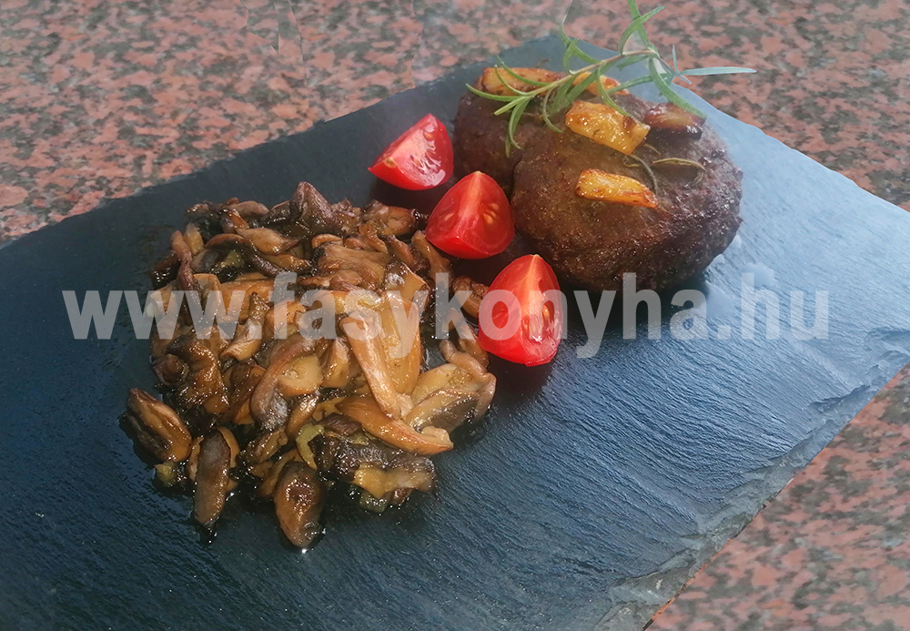 A bőrös libamellet ledaráljuk, apróra vágott friss rozmaringgal, sóval ízesítjük, és jól összegyúrjuk, majd pogácsákat formázunk belőle és egy serpenyőben mindkét oldalát a fokhagymagerezdekkel együtt aranybarnára sütjük. Közben a tisztított gombát szeletekre, a hagymát finomra vágjuk, olívaolajon megdinszteljük, azután tetszés szerint rozmaringgal és paradicsommal köretként tálaljuk a húspogácsa mellé.