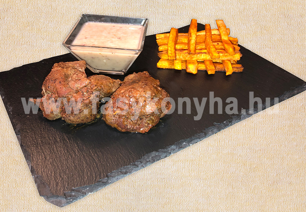 A húst 8 szeletre vágjuk és enyhén kiklopfoljuk. A vöröshagymát kockákra, a petrezselyemzöldjét finomra, a fokhagymát karikákra vágjuk, majd a hússal együtt, fedő alatt olajon megdinszteljük, sóval, borssal ízesítjük. Felöntjük annyi vízzel, hogy ellepje, egy forralás után, lassú tűzön puhára főzzük, majd a húst kivesszük, és mindkét oldalát megpirítjuk. Menet közben a burgonyát meghámozzuk, vékony hasábokra vágjuk, azután forró olajban kisütjük és esztétikusan a szilvaszósszal a hús mellé kínáljuk.