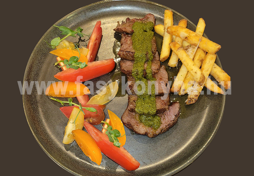 Az olajat egy edényben felforrósítjuk és egészben belerakjuk a sóval, borssal bedörzsölt, fehérpecsenyét, a fokhagyma gerezdeket, a kettévágott vöröshagymát és folyamatosan forgatva kérget sütünk rá. Felöntjük annyi folyadékkal, hogy ellepje, azután lassú tűzön fedél alatt puhára pároljuk majd melegen tartjuk. A spenótot vajban megpároljuk, liszttel meghintjük, tejjel felöntjük, sóval ízesítjük és krémesre főzzük. A hasábburgonyát megsütjük, feldaraboljuk a paradicsomokat és a felszeletelt, spenótmártással ízesített hús mellé esztétikusan köretként tálaljuk.