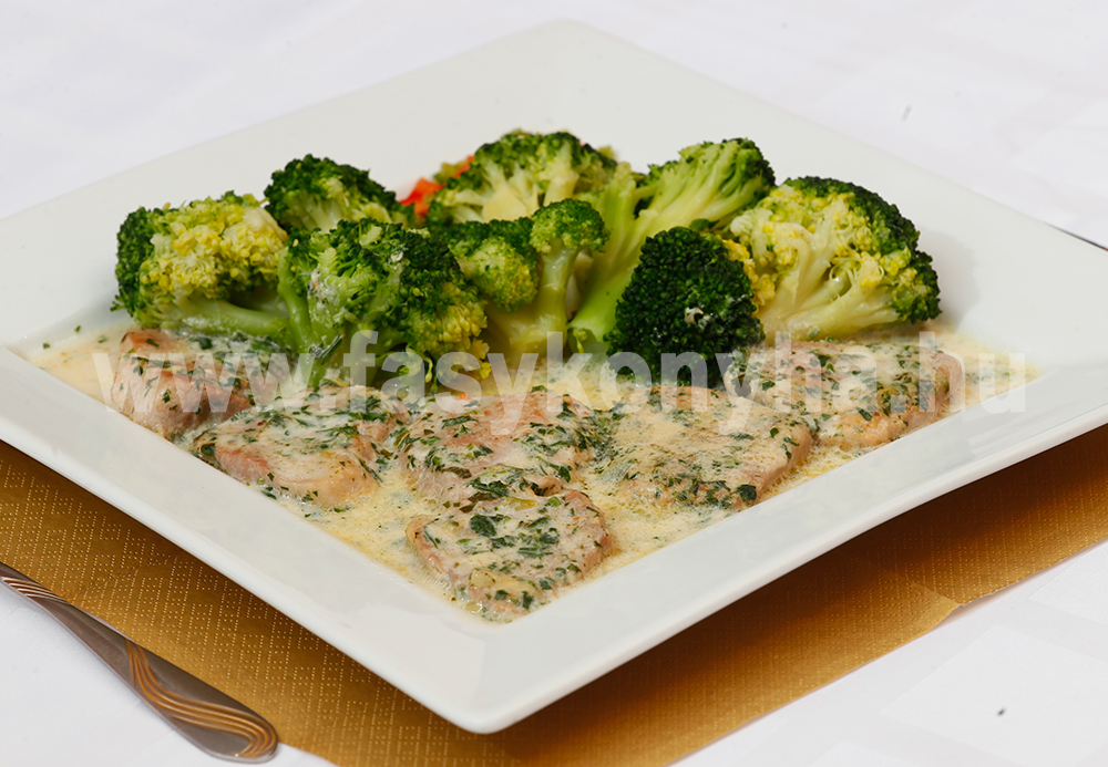 A szűzérmét sóval, borssal bedörzsöljük, alufóliára rakjuk, olajjal meglocsoljuk, azután becsomagoljuk. 200 ⁰C-os előmelegített sütőben, kb. 25 percig sütjük. Ezt követően a fóliából kicsomagoljuk, puhára sütjük és félrerakjuk. A brokkolit rózsákra szedjük, enyhén sós vízben megfőzzük, majd vajban megpároljuk. A lisztet vajon felhevítjük, hozzáadjuk a finomra vágott petrezselyemzöldjét, a felkarikázott fokhagymát, tejjel felöntjük, sóval, borssal ízesítjük és krémesre főzzük. A petrezselymes mártásba belerakjuk a szeletekre vágott sült húst és egy forralás után a párolt brokkoli rózsákkal esztétikusan tálaljuk.