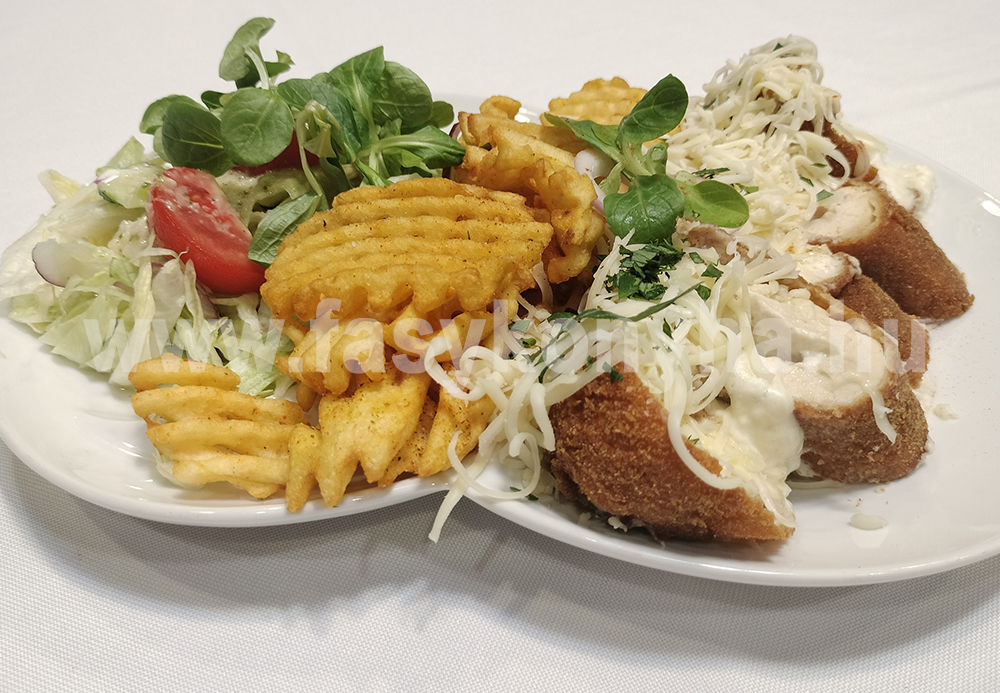 A csirkemellet 8 szeletre vágjuk, kiklopfoljuk, sózzuk, borsozzuk, vastagon megkenjük a krémsajttal és óvatosan feltekerjük. A tojásokat liszttel simára keverjük, sóval ízesítjük, azután a töltött húst belemártjuk, majd zsemlemorzsában megforgatjuk és forró olajban aranybarnára sütjük. A megtisztított burgonyát hullámvágóval felszeleteljük, pár percig enyhén sós vízben előfőzzük, lecsepegtetjük, majd bő, forró olajban aranybarnára sütjük. Végezetül a töltött hústekercseket éles késsel felszeleteljük, és ízlésesen tálaljuk zöldsalátával, reszelt sajttal és friss petrezselyemzöldjével meghintve.