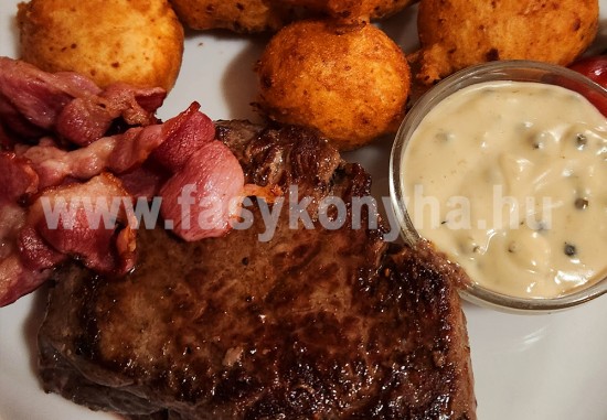 A fehérpecsenyét négy szeletre vágjuk, mustárral, borssal bedörzsöljük, egy edénybe rakjuk, olajjal felöntjük és 72 óráig hűtőszekrényben érleljük. Sütés előtt szalvétával az olajat felitatjuk, sóval ízesítjük és olajban mind a két oldalát megsütjük, majd kevés vízzel felöntjük, fedő alatt lassú tűzön puhára pároljuk. Menet közben a bacon szalonnát olívaolajon megpirítjuk és a hús mellé kínáljuk a zöldborsmártással és a burgonyafánkkal.