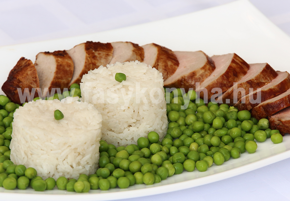 A szűzérmét sóval, borssal bedörzsöljük, alufóliára rakjuk, olajjal meglocsoljuk és becsomagoljuk. 200 oC -os előmelegített sütőben, kb. 25 percig sütjük. Ezt követően a fóliából kicsomagoljuk és aranybarnára sütjük. Közben a borsót kifejtjük és vajon megpároljuk. A rizst átmossuk, 1 l forrásban lévő, enyhén sós vízbe beletesszük, hozzáadjuk a tisztított vöröshagymát, és állandó kevergetés mellet puhára főzzük. Végezetül a hagymát kivesszük belőle, leszűrjük és formázva tálaljuk a felszeletelt hús és a zöldborsó mellé.
