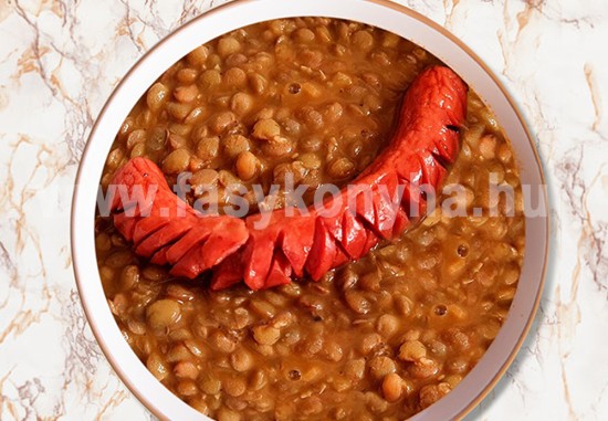 A reszelt fokhagymát és a lisztet kevés olajon rövid idő alatt megpirítjuk, meghintjük őrölt pirospaprikával, felöntjük a konzerv levével, beletesszük a babérlevelet és csomómentesre keverjük. Beleöntjük a lencsét, sóval, borssal ízesítjük és állandó kevergetés mellett rövid idő alatt készre főzzük. A virsliket bevagdaljuk, kevés olajon megpirítjuk és feltétként tálaljuk.