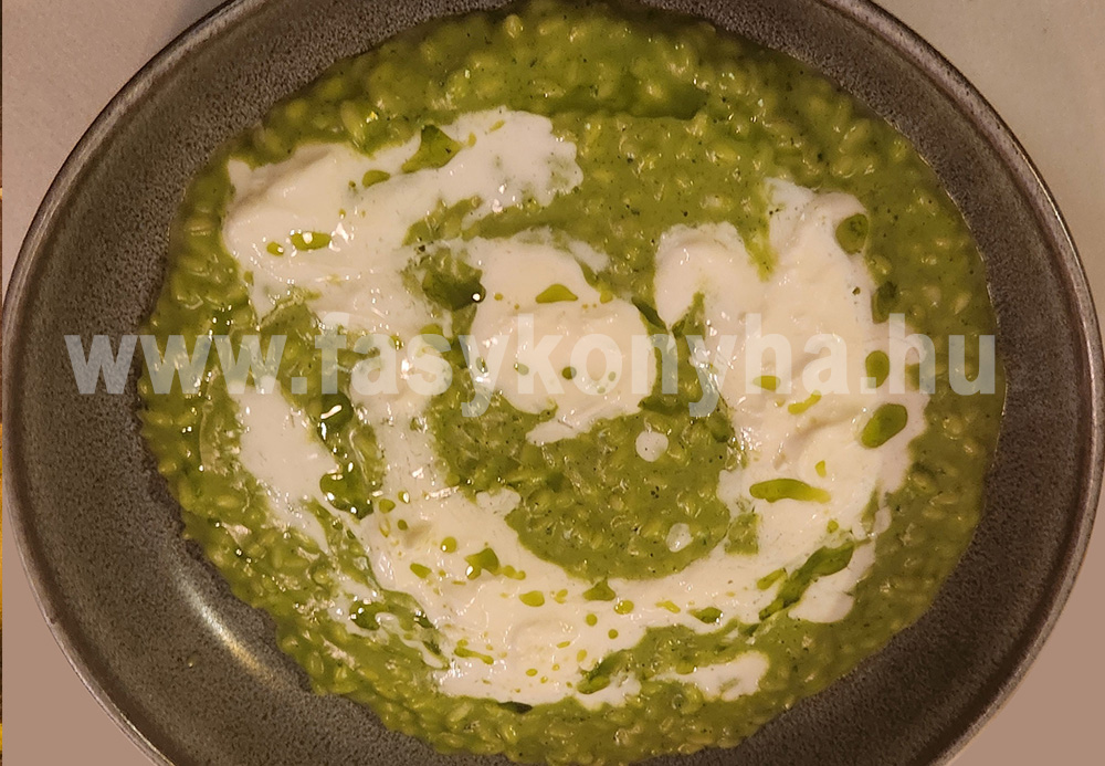 A rizottó rizst zöldséglében, állandó kevergetés mellett puhára főzzük. Közben a bébispenótot leforrázzuk, lecsepegtetjük, kevés olívaolajon megdinszteljük, sóval, borssal ízesítjük, majd botmixerrel krémesítjük. A forró rizshez hozzákeverjük a spenótot, egy forralás után a tűzről levéve óvatosan elvegyítjük benne a mascarponét és a reszelt parmezánt. Lefedve kb. 5 percig állni hagyjuk, majd forrón tálaljuk.