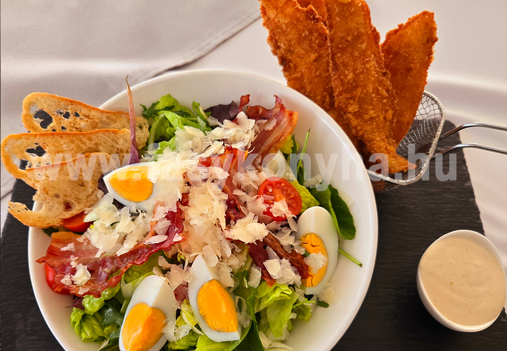A csirkemellfilét felszeleteljük, sóval meghintjük, folpackon keresztül kiklopfoljuk, lisztben majd enyhén sós, felvert tojásban (3 db) megforgatjuk, azutá a kukoricaprézliben, végül forró olajban aranybarnára sütjük. A megtisztított és átmosott salátaleveleket apró darabokra tépkedjük, hozzáadjuk a rukkolát, a bébi spenótot, a félbevágott koktélparadicsomokat, sóval, borssal fűszerezzük, meglocsoljuk balzsamecettel, majd összekeverjük. Tálaláskor a salátára helyezzük az olívaolajon megpirított baconszalonnát, a menet közben keményre főzött, megtisztított, négyfelé vágott tojásokat és meghintjük finomra szeletelt parmezánsajttal. A rántott csirkemellel, majonézzel és pirítóssal kínáljuk.