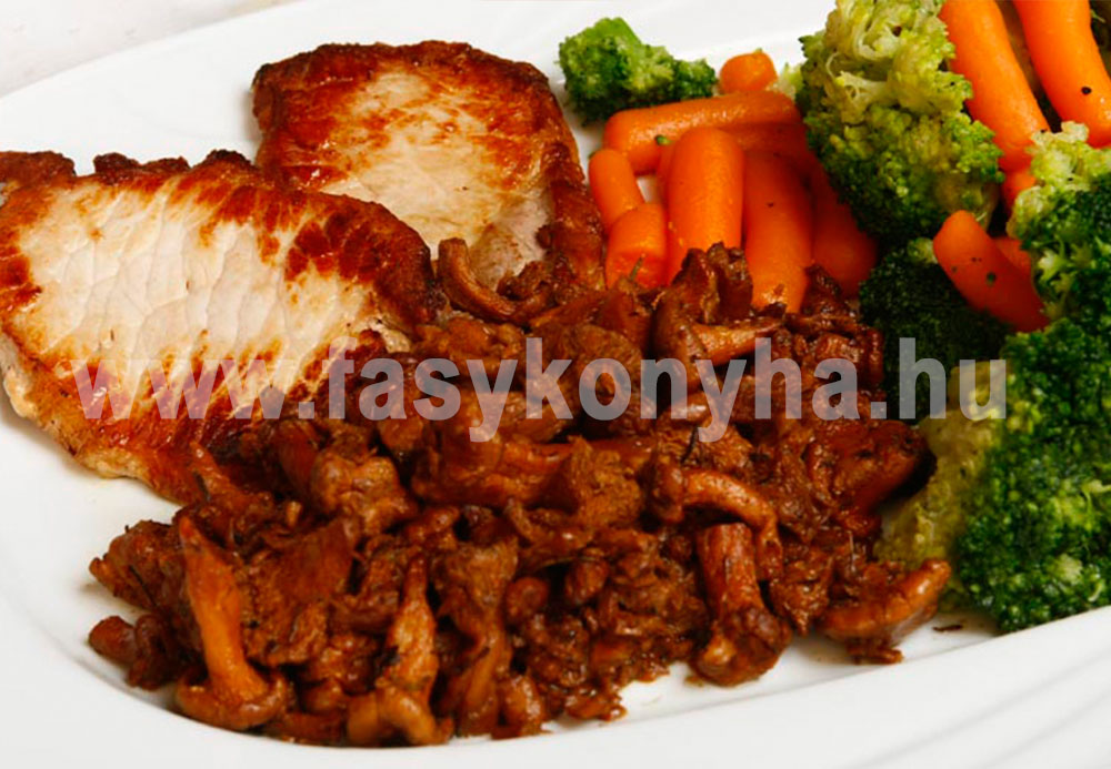 A húst nyolc szeletre vágjuk, sóval ízesítjük. A vajat felhevítjük, a húsok mindkét oldalát megpirítjuk, majd nagyon alacsony lángon fedő alatt puhára pároljuk. A felkockázott hagymát és a rókagombát olajon megpirítjuk, sóval ízesítjük. Menet közben a brokkolit és a bébirépát sós vízben egy forralásig, roppanósra főzzük, majd leszűrjük; köretként tálaljuk a gombával együtt a hús mellé.