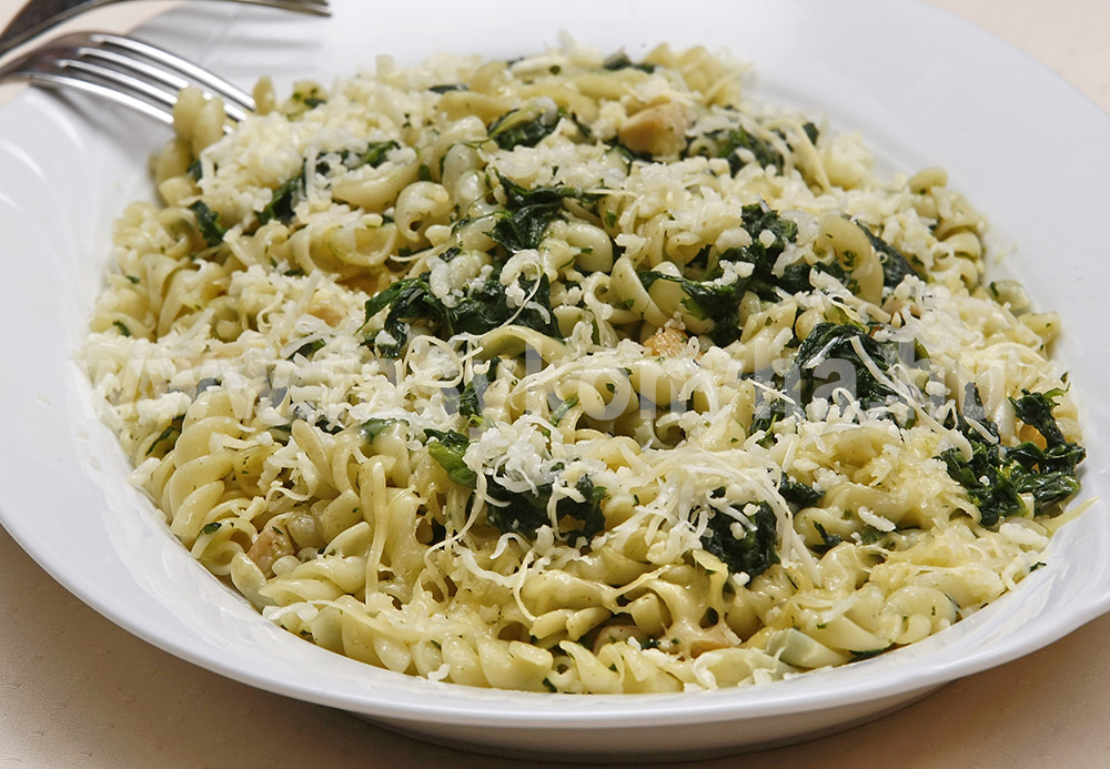 A kockákra vágott húst vajban megpirítjuk, hozzáadjuk a tört fokhagymát és a forrázott spenótot majd tejjel felöntjük, lassú tűzön rövid idő alatt készre főzzük. Közben enyhén sós vízben kifőzzük a tésztát, leszűrjük és összekeverjük. Forrón tálaljuk, és megszórjuk reszelt sajttal.