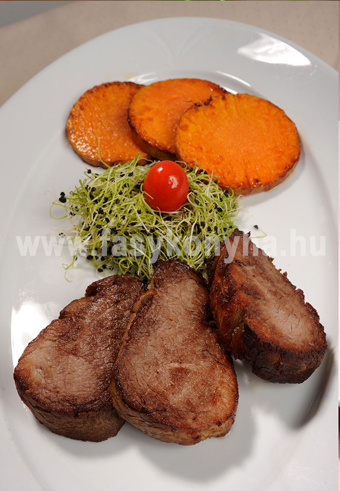 Elkészítési mód:A szűzérmét 12 szeletre vágjuk, sóval, borssal ízesítjük, és olajon megsütjük. A tököt meghámozzuk, karikákra vágjuk és rostlapon megpirítjuk. Köretként búzacsírával, paradicsommal díszítve tálaljuk a hús mellé.
