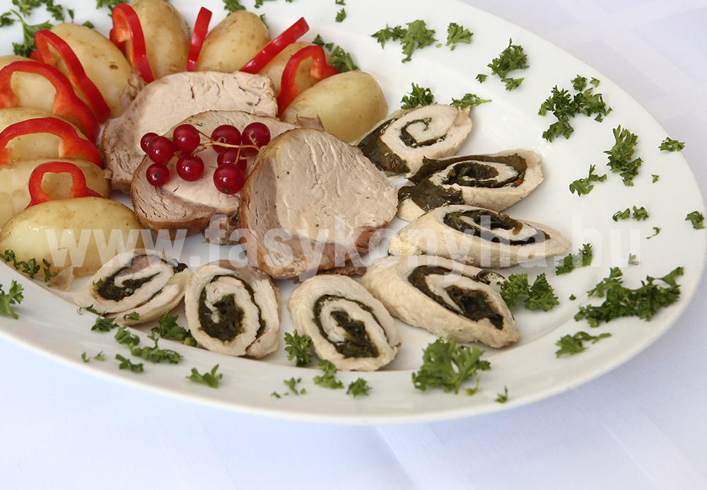 A csirkemellfilét éles késsel szétnyitjuk, majd folpackon keresztül kiklopfoljuk, és alufóliára helyezzük. Azután olajban felhevített fokhagymapéppel bedörzsöljük, sóval meghintjük, majd leterítjük a sóskaleveleket. A széleit a felvert tojással bekenjük, majd óvatosan feltekerjük, és még egy alufóliába csomagoljuk. Tepsibe helyezzük, kb. 30 perc alatt előmelegített sütőben készre sütjük. A fóliából kicsomagoljuk és hagyjuk kihűlni. A sertéskarajt egészben sóval, borssal bedörzsöljük, fóliába tekerjük, egy edényben, kb. 30 perc alatt megpároljuk, majd a fóliából kibontjuk. Tepsibe rakjuk, olajjal meglocsoljuk, és 150 °C fokos, előmelegített sütőben készre sütjük. Közben a burgonyát egészben megfőzzük, a héjától megtisztítjuk. Hosszában kettévágjuk, sóval meghintjük, és köretként tálaljuk a felszeletelt húsok mellé.