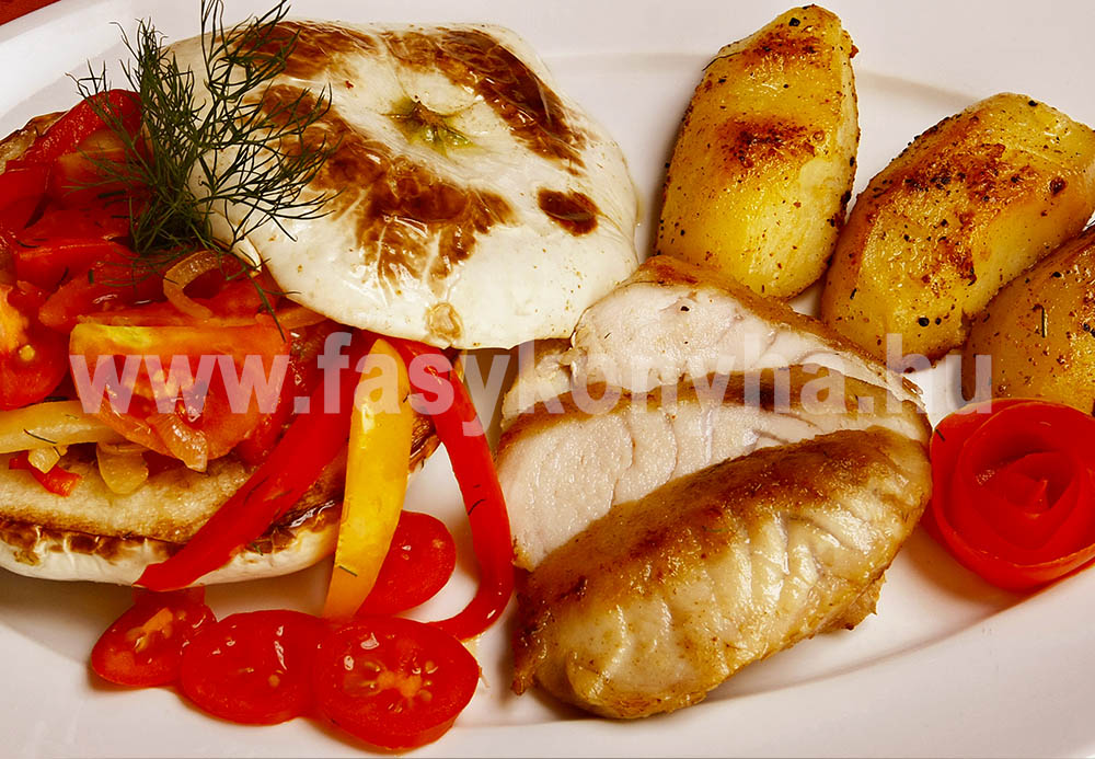 A süllőt felszeleteljük, megsózzuk, és hűtőbe rakjuk. A burgonyát megpucoljuk, és egészben enyhén sós vízben megfőzzük, a süllővel, a keresztbe kettévágott, belsejétől megtisztított patisszonokkal együtt rostlapon megsütjük. Közben elkészítjük a lecsót: a hagymát karikákra, a paprikákat hosszába vágjuk, zsíron lepirítjuk, hozzáadjuk a feldarabolt paradicsomot, a finomra aprított kaprot, sóval, borssal ízesítjük, majd őrölt pirospaprikával meghintjük, összekeverjük, és fedő alatt puhára pároljuk. A sült halat esztétikusan, a sült burgonyával, a patisszonba töltött lecsóval, kaporral és paradicsomrózsával díszítve kínáljuk.