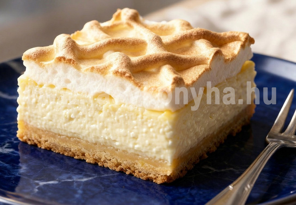 A tészta hozzávalóit összegyúrjuk. Fontos tudni, hogy ez a tészta nem nyújtható, ezért egy kivajazott és kilisztezett tepsibe helyezve, lisztes kézzel, finom és egyenletes mozdulatokkal nyomkodjuk szét. A túrót összekeverjük a frissen facsart citromlével, majd hozzáadjuk a cukrot, a 2 db egész tojást, a 3 db tojássárgáját, (a 3 db tojásfehérjét tegyük félre, a későbbiekben még szükségünk lesz rá) a pudingot, majd felöntjük tejjel és összekeverjük. Ne lepődjenek meg, ha egy híg masszát kapnak. Ezt öntsük a tepsiben lévő tésztára. Előmelegített sütőben, kb. 160 °C-on, 50 percig sütjük. Menet közben egy keverőedényben a 3 db tojás fehérjéhez adjunk hozzá 3 evőkanál cukrot és habverő segítségével kemény habbá verjük fel. (Megj.: A tojásfehérjét mindig közvetlenül a felhasználás előtt verjük fel, és ne hagyjuk állni, mivel elveszíti állagát.) Amikor majdnem kész a süti, vegyük ki a sütőből, kenőkés segítségével kenjük a habot a tetejére, majd tegyük vissza a sütőbe és addig süssük, míg a hab szép aranysárgára pirul. A süteményt hagyjuk teljesen kihűlni, majd néhány órára hűtőszekrénybe helyezzük, ezt követően szeletelve tálaljuk.