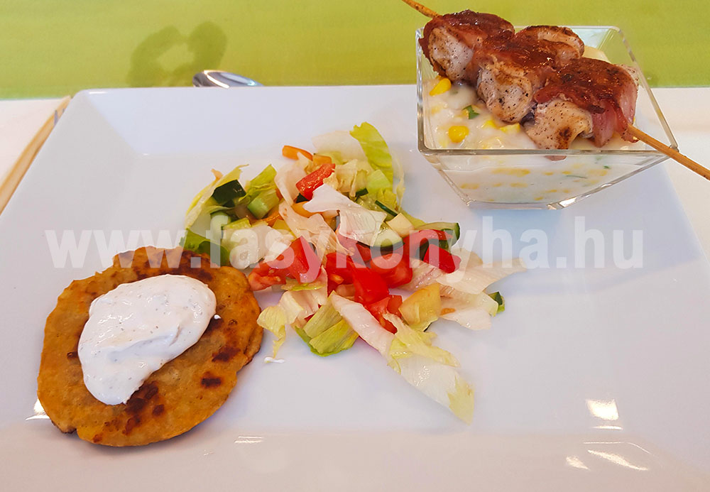 A szűzérmét keresztben felszeleteljük, sóval, borssal ízesítjük, baconbe tekerjük, és hármasával hurkapálcára felszúrjuk. Rostlapon állandó forgatás mellett megsütjük. A zúzott fokhagymát kevés olajon felhevítjük, liszttel megszórjuk, felöntjük tejjel, egy forralás után hozzáadjuk az előfőzött, zsenge kukoricát, tejföllel dúsítjuk, és egy forralás után köretként üvegtálkában tálaljuk a lapcsánkával együtt salátával díszítve a nyárson sütött hús mellé.