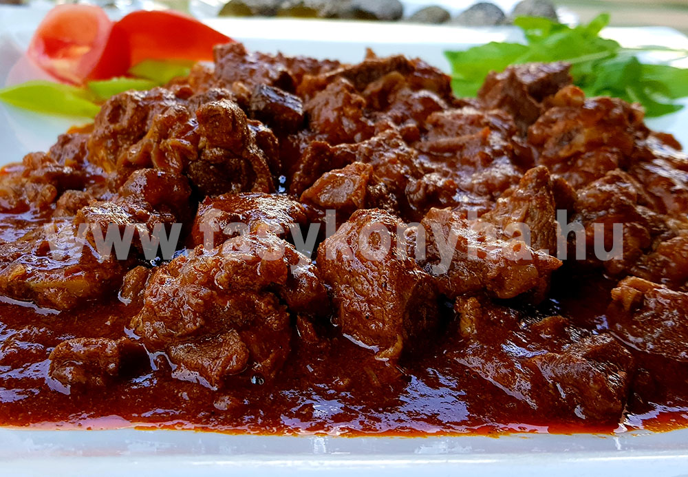 Elkészítési mód:A hagymát zsíron megpirítjuk, majd hozzáadjuk az átmosott, kockázott marhahúst. Sóval, borssal, köménymaggal fűszerezzük, zsírjára sütjük, azután belerakjuk a héjától leforrázott paradicsomot, a kockákra vágott paprikát és a zúzott fokhagymát. Meghintjük őrölt pirospaprikával, összekeverjük, zsírjára pörköljük, majd felöntjük annyi vízzel, hogy ellepje, és állandó kevergetés mellett lassú tűzön, kb. 2,5 – 3 óra alatt puhára főzzük. Ha a levét lefővi, a folyadékot pótoljuk. Sós tört burgonyát és kovászos uborkát kínálunk mellé.