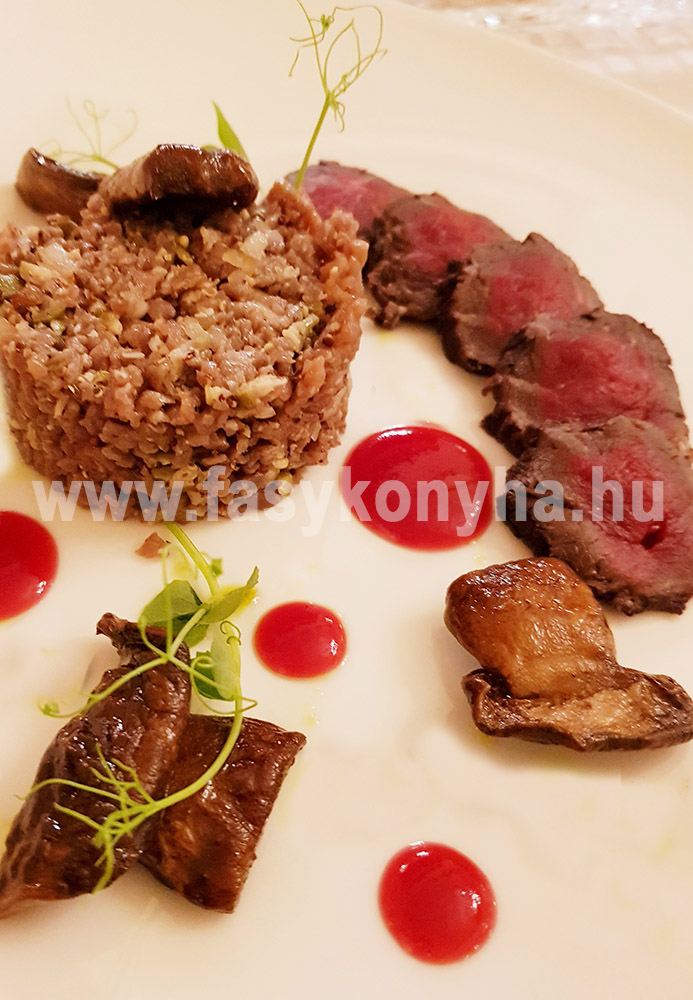 A lehártyázott szűzérmét sóval, borssal ízesített mustárral bedörzsöljük, forró olajban megsütjük. Közben az olajon megpirított tarhonyát felöntjük fél liter vízzel, és állandó kevergetés mellett puhára főzzük. A vargányagombát megpirítjuk. A szűzérmét karikákra vágjuk, köretként formába öntött tarhonyát és vargányagombát tálalunk mellé.