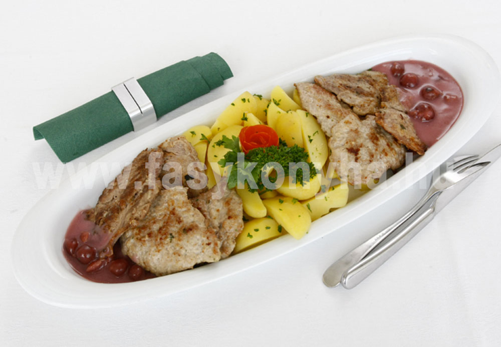 A húst 8 db érmére szeleteljük, megsózzuk és folpackon keresztül enyhén kiklopfoljuk. Mindkét oldalát lisztbe mártjuk és olajban pirosra sütjük. Menet közben a burgonyát meghámozzuk, hasábokra vágjuk és sós vízben megfőzzük. A finomra vágott friss petrezselyemzöldjét vajban megfuttatjuk és hozzáadjuk a főtt burgonyát. Sóval után ízesítjük, összekeverjük és köretként tálaljuk a hús mellé.