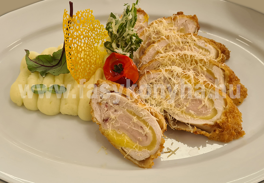 A csirkemellet 8 szeletre vágjuk, kiklopfoljuk, ráhelyezzük a sajtot, a sonkát, majd óvatosan feltekerjük. A tojásokat liszttel simára keverjük, sóval ízesítjük, azután a töltött húst a tojásba belemártjuk, zsemlemorzsában megforgatjuk, és forró olajban aranybarnára sütjük. A reszelt sajtból egyenlő halmokat szórunk egy sütőpapírral bélelt tepsibe, majd sütőben 200° C-on, néhány perc alatt ropogósra sütjük. A töltött hústekercseket éles késsel felszeleteljük, legyezőszerűen tálaljuk, mellé köretkénként burgonyapürét kínálunk. Sajtcsipsszel, paradicsommal esztétikusan díszítve, reszelt sajttal megszórva tálaljuk.