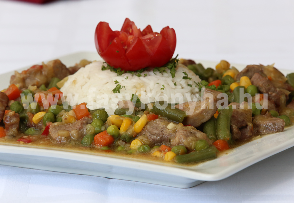 Elkészítési mód:A sertésszűzérmét, a vöröshagymát kockára, a fokhagymát karikára vágjuk, olajon megdinszteljük, sóval ízesítjük, azután zsírjára sütjük. Hozzáadjuk a zöldségmixet, kevés folyadékkal felöntjük, puhára pároljuk és rövid idő alatt készre főzzük. Rizzsel és paradicsommal díszítve esztétikusan kínáljuk.