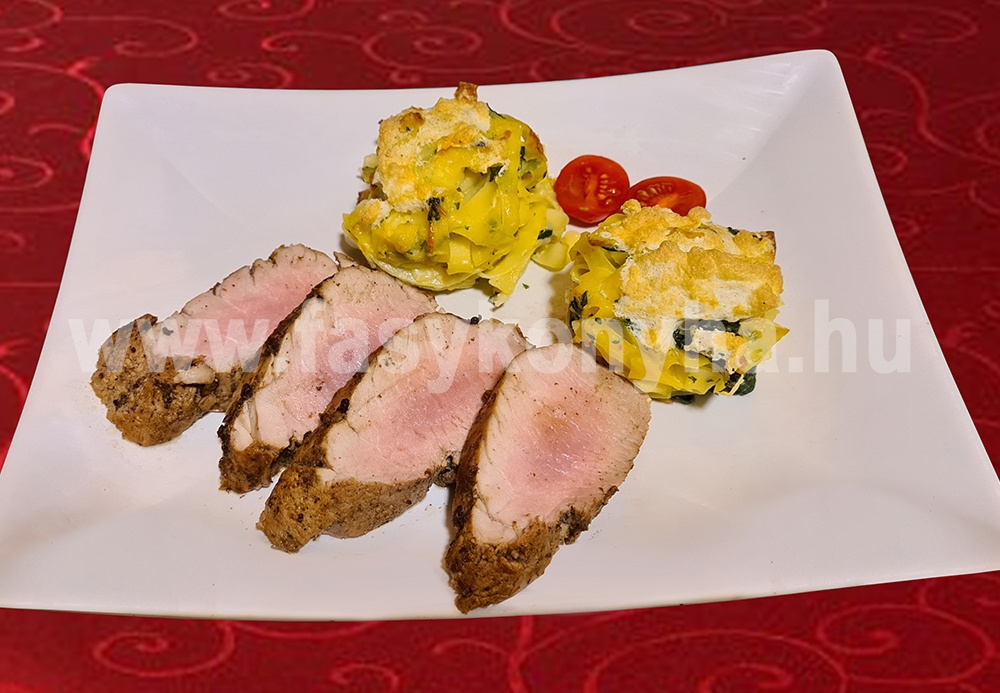 A mustárt összekeverjük a fűszerekkel és bedörzsöljük vele a húst. Forró olajban, körben forgatva kérget pirítunk rá, majd lassú tűzőn készre sütjük. Közben vajon megdinszteljük a spenótot, hozzáadjuk a juhtúrót, majd a tejet, krémesre forraljuk és összekeverjük az enyhén sós vízben megfőzött tésztával. A húst felszeletelve paradicsommal díszítve ízlésesen tálaljuk a juhtúrós spenótos tésztaköret mellé.